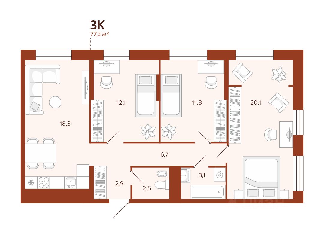 Продаётся 3-комнатная квартира в строящемся доме (ГП-2 (Новаторов, 30)), срок сдачи: II-кв. 2026, общей площадью 77.34 кв.м., на 8 этаже. Новый жилой комплекс "Новатор" от застройщика ГК "СБК" расположен по адресу: г. Тюмень по ул. Новаторов.
