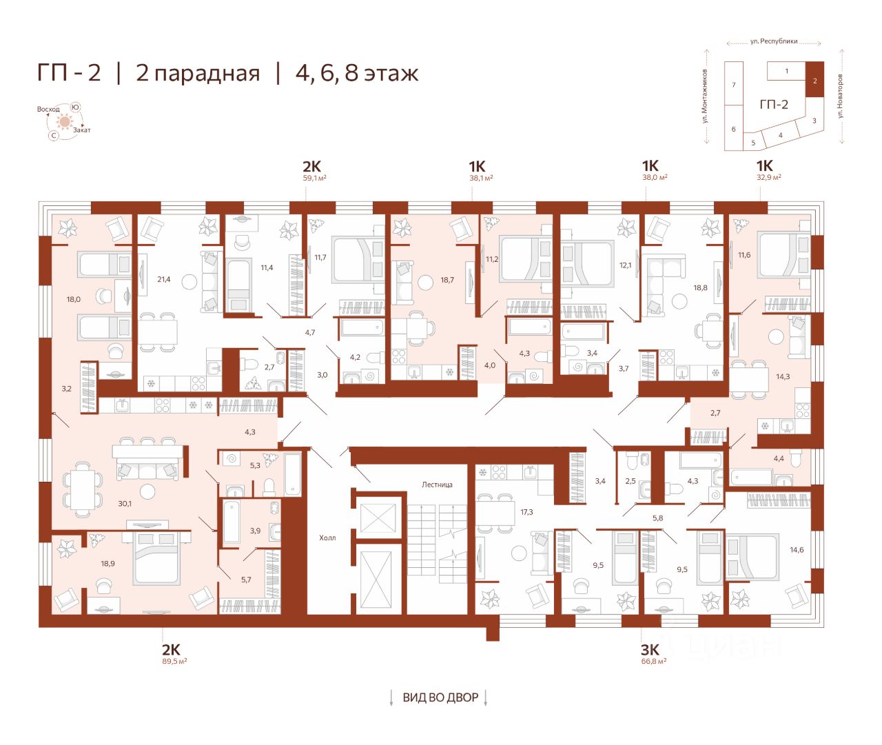 Продаётся 3-комнатная квартира в строящемся доме (ГП-2 (Новаторов, 30)), срок сдачи: II-кв. 2026, общей площадью 66.82 кв.м., на 8 этаже. Новый жилой комплекс "Новатор" от застройщика ГК "СБК" расположен по адресу: г. Тюмень по ул. Новаторов.