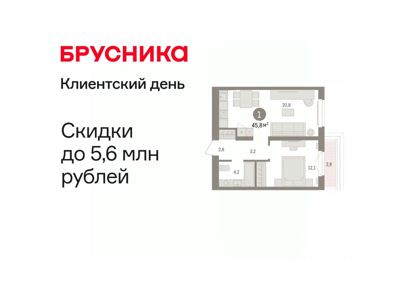 Квартира с кухней-гостиной и одной спальней в кварталах "На Минской". Особенности планировки: предчистовая отделка.
