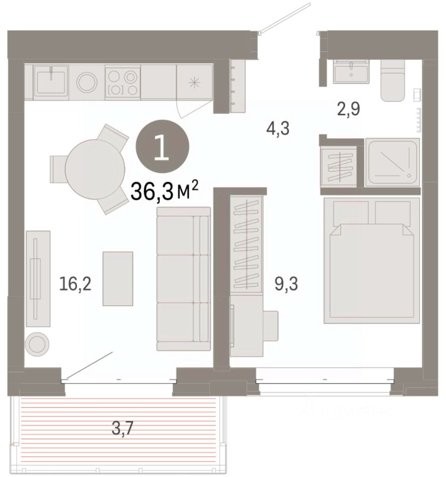 Квартира с кухней-гостиной и одной спальней в кварталах "На Минской". Особенности планировки: балкон, предчистовая отделка.