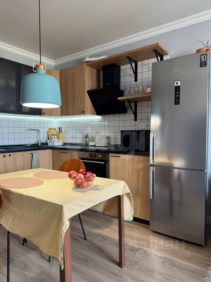 Кухня полностью укомплектована современной техникой и мебелью: встроенная варочная панель, духовой шкаф, вытяжка, холодильник, обеденная зона. Много мест для хранения, качественные материалы и аккуратные линии подчеркивают статус и практичность пространства.