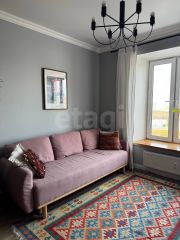 Гостиная зона светлая и просторная, с удобным диваном и текстильными акцентами. Большие окна наполняют пространство естественным светом, а тщательно подобранные детали интерьера формируют атмосферу спокойного городского жилья высокого уровня.