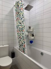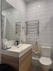 Санузел выполнен в минималистичном стиле: ванна с тропическим душем, качественная сантехника, современная отделка, ощущение отельного комфорта.