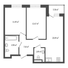 Планировка включает в себя: просторную кухню-гостиную 20,5 м2 с выходом на застекленную лоджию, 2 спальни, 2 с/у, прихожую. Окна выходят на улицу.