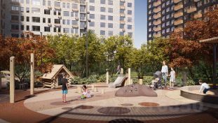 - Во дворах нет машин, шума, выхлопных газов и посторонних людей. Всё пространство разделено на зоны по интересам и возрастам. Для детей — игровые площадки из эко-материалов и мягкая защита от падений. Для взрослых — зоны отдыха, воркаут-площадки и тропинки для неспешных прогулок.