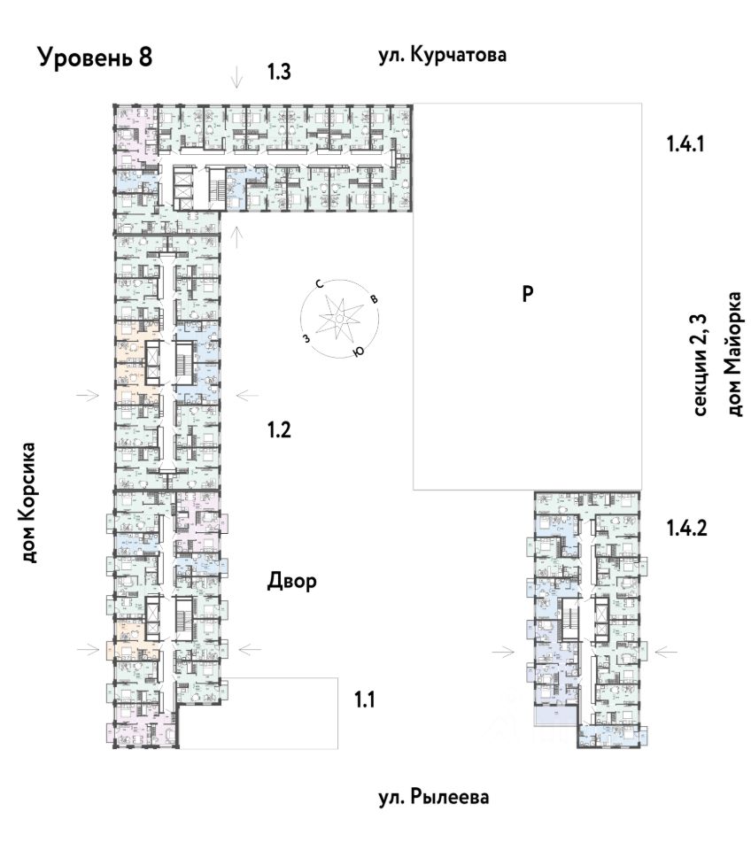 Развитое жилое пространство — закрытые дворы-сады, свои набережная и бульвар, торговая галерея на 1-м этаже, рядом детсады, школы и поликлиника.