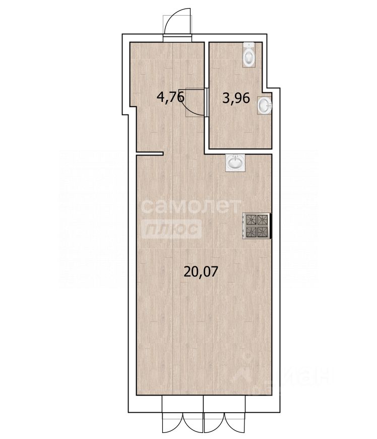 В данной студии функциональная планировка: просторный коридор, совмещенный санузел, кухня-гостиная, где возможно реализовать уютный и компактный дизайн с учетом грамотного и удобного зонирования.