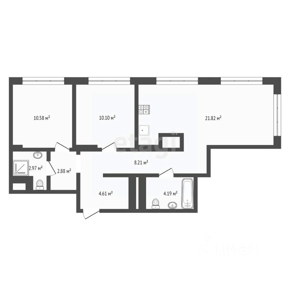 Квартира Евротрешка - кухня-гостиная 21.8 кв.м, две изолированные комнаты 10.6 и 10.1 кв.м, два санузла. Улучшенная черновая отделка.