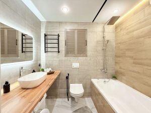 - Полы: керамогранит в коридоре, санузле и на балконе с системой "теплый пол". Ламинат в остальных комнатах.