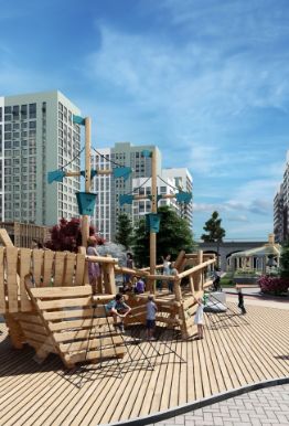 Два уровня комфорта. Между домами раскинется большой двухуровневый пешеходный бульвар с уголками для отдыха, площадками для детей, спортивных игр и тренировок.