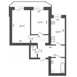 комнаты 20 м² и 14 м², кухня 12 м2, санузел 6 м2, лоджия 6 м2, гардеробная 4,5 м2.