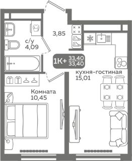Прямая продажа от застройщика! Продается однокомнатная квартира в строящемся ЖК "Меридиан Слобода", срок сдачи: I-кв. 2027, общей площадью 33.4 м², на 9 этаже из 21. Площадь кухни — 15.01 м².