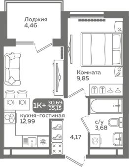 Прямая продажа от застройщика! Продается однокомнатная квартира в строящемся ЖК "Меридиан Слобода", срок сдачи: I-кв. 2027, общей площадью 30.69 м², на 13 этаже из 21. Площадь кухни — 12.99 м².