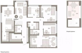Квартира с кухней-гостиной и четырьмя спальнями в жилом районе "Зарека". Особенности планировки: зенитное окно, летняя кухня на крыше, предчистовая отделка, терраса на крыше.