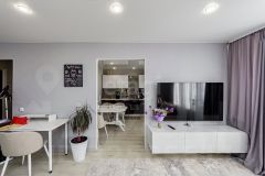Современный ремонт в спокойных тонах (натяжные потолки, линолеум, кафель в санузле)