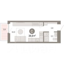 1-комн. студия от застройщика с предчистовой отделкой в ЖК "Зарека" на 13 этаже. Общая площадь: 26.57 кв.м., площадь гостиной 16.9 кв.м., из которых 5 кв.м. выделено под кухонную зону. Все окна выходят на одну сторону. В квартире один балкон, один совмещенный санузел. Высота потолков 2.7 м.