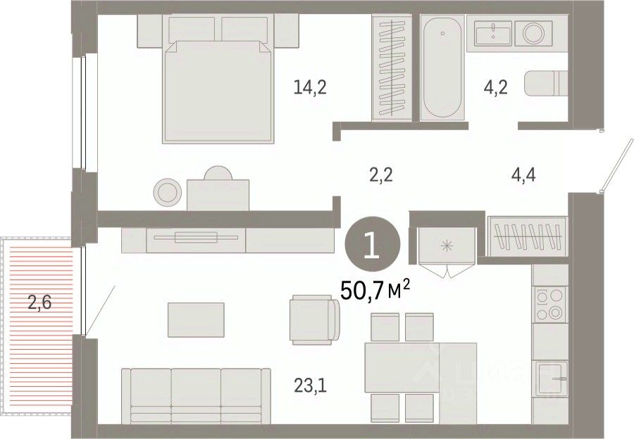 1-комн. квартира с предчистовой отделкой в ЖК "Зарека" на 14 этаже. Общая площадь: 50.66 кв.м., жилая: 14.2 кв.м., площадь просторной кухни-гостиной: 23.1 кв.м. Все окна выходят на одну сторону. В квартире один балкон, один совмещенный санузел. Высота потолков 2.7 м.