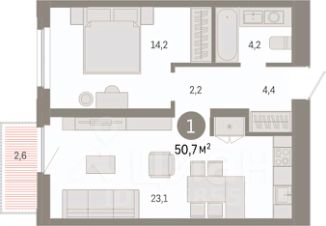 1-комн. квартира с предчистовой отделкой в ЖК "Зарека" на 13 этаже. Общая площадь: 50.66 кв.м., жилая: 14.2 кв.м., площадь просторной кухни-гостиной: 23.1 кв.м. Все окна выходят на одну сторону. В квартире один балкон, один совмещенный санузел. Высота потолков 2.7 м.