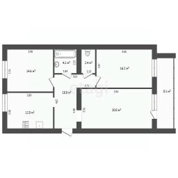 - Просторные комнаты: гостиная-кухня — 16 м², три изолированные спальни — 12, 14 и 20 м²