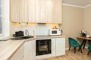 Кухня-гостиная оборудована новой кухонной мебелью и техникой( встроенный холодильник и встроенный духовой шкаф, микроволновая печь), а также имеет стильный кухонный стол и стулья.