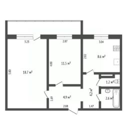 раздельный санузел - туалет 1.2 м², ванная 2.6 м²