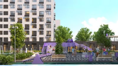 19-этажная архитектурная доминанта с эффектом паруса и камерная секция: французские балконы, сити-хаусы на 1-м этаже, 9 этажей в доме. Уступчатая структура формирует динамичный силуэт — новый акцент ул. Полевая. Металлические балконы создают градиент от тёмного к светлому, большие окна — панорамные виды на город.