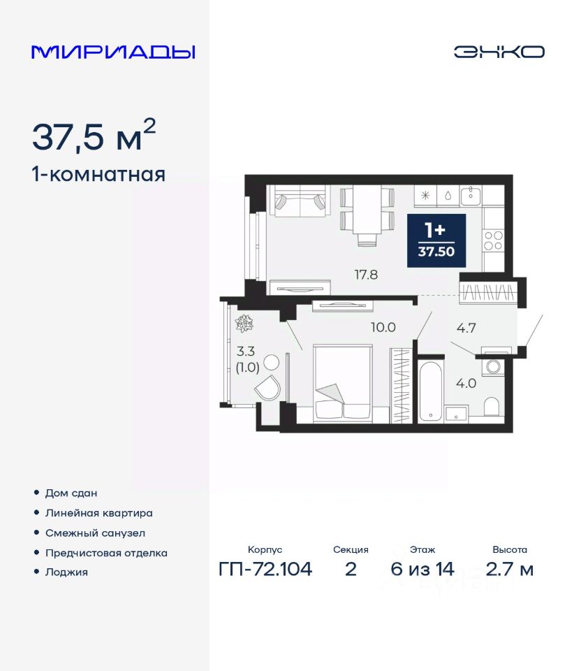 Продается однокомнатная квартира с предчистовой отделкой в ЖК "Мириады" на 6 этаже. Общая площадь: 37.5 кв.м., жилая: 10 кв.м., площадь просторной кухни-столовой: 17.8 кв.м. Все окна выходят на одну сторону. В квартире одна лоджия, один совмещенный санузел. Высота потолков 2.7 м.