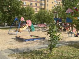 Во дворе расположены детские и спортивные площадки для футбола, волейбола и баскетбола.
