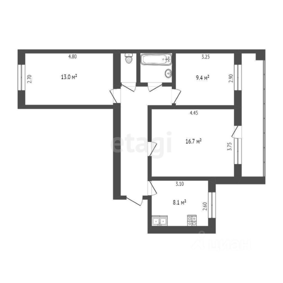 - Просторная планировка: три изолированные комнаты, кухня, ванная, туалет, балкон.