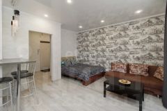 Свежий косметический ремонт: покрытие пола комбинировано: коридор и зона кухни керамогранит, жилая часть - ламинат. Стены и полы в сан.узле - так же керамонгрнит. На стенах обои, натяжной потолок. Есть вся необходимая для проживания мебель и батовая техника (остается по согласованию).