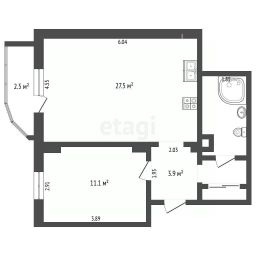 Ключевым преимуществом квартиры является современная и рациональная планировка формата 1+, где объединенная кухня-гостиная площадью 27 кв. м создает основное светлое пространство для жизни и приема гостей.