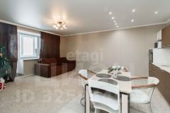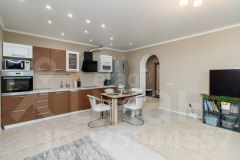 В квартире выполнен качественный ремонт: полы из керамогранита в прихожей и кухонной зоне и ламината в жилых комнатах, натяжные потолки, оклеенные обоями стены и полностью отделанный плиткой совмещенный санузел.