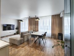 ВИДОВАЯ КВАРТИРА на р. Тура!!!! Продается просторная квартира 2+, с современным ремонтом и видом на р.Тура (набережная в перспективе) на 15 этаже в новом микрорайоне Тюмени "Айвазовский". Квартира находится на солнечной стороне, очень светлая и теплая. Удобный выезд из микрорайона на 2 основные магистрали города и на ТКАД. Рядом (через дорогу, в 5 минутах ходьбы) находится офис компании "Новатэк". Отсутствуют проблемы с парковочными местами. Предусмотрен подземный паркинг. 5 квартир на площадке. Общая площадь квартиры 75,96 м2. Высота потолка 2,7 м. В квартире сделан ремонт в стиле "Современная Классика". При проведении ремонта использованы качественные материалы. Ремонт сделан в теплых тонах. Стены декоративная штукатурка. В квартире полностью заменена электропроводка от застройщика и полностью (от коллекторного узла в коридоре) поменяны магистрали холодной и горячей воды на трубы из шитого полипропилена. Установлены магистральные фильтры, система, которая предотвращает протечку воды, проточный водонагреватель Electrolux. Двери "Волховец", со стильной фурнитурой. - Кухня-гостиная 33,16 кв.м. с 2 окнами - сердце квартиры, разделена на 2 зоны. Зона ТВ с современным диваном и большим телевизором, зона столовой, установлен большой стол с керамической столешницей 900х1600 мм. (с возможностью трансформации в 900 х 2400 мм.), укомплектован удобными стульями. Кухня укомплектована столешницей из иск.камня. Фартук сделан из керамогранита. Есть бар с подсветкой. Холодильник "Liebherr". Установлен фильтр для питьевой воды, с накопительным баком. Вытяжка островная, подсветка зоны кухни гостиной стильная и необычная. Посудомоечная машина, микроволновая печь, духовой шкаф. В гостиной установлен кондиционер Electrolux, с большим запасом мощности. Датчик от протечки воды. - Спальня 19,63 кв.м. с удобной гардеробной, где применено необычное решение. Просыпаешься с видом на рассвет. Кровать развернута к окнам. Оборудована полноценная гардеробная комната, наполнение продумано до мелочей. В спальне установлена принудительная приточная вентиляция (Airnanny A7 Forever). Установка согласована с управляющей компанией. Сон глубокий и качественный, благодаря очищенному воздуху. Окна практически не открываем, пыли нет, благодаря 3-х ступенчатой фильтрации. - Мастер-спальня (она же детская, она же гостевая комната) - 13,53 кв.м. Сейчас оборудована библиотекой с подсветкой, рабочим столом и подвесным комодом для хранения вещей. Установлен стильный диван. Предусмотрена подсветка рабочей зоны. - санузел 4,6 кв.м. облицован комбинированным керамогранитом, реализована душевая кабина со стеклянным ограждением, современным и надежным сливным трапом. Пол, в том числе в душевой кабине, с подогревом. Установлен вертикальный полотенцесушитель "Сунержа", столешница на тумбе сделана из керамогранита, раковина "Catalano". Зеркало с подсветкой и диммером. Датчик от протечки воды. Затирка швов эпоксидная. - 2-й санузел переоборудован в хоз.блок. Предусмотрены сте МЫ