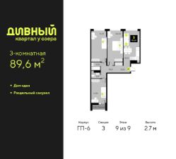3-комн. квартира в ЖК "Дивный квартал у озера" на 9 этаже. Общая площадь: 89.6 кв.м. Высота потолков 2.7 м.