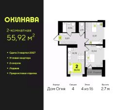 2-комн. квартира с предчистовой отделкой в ЖК "Окинава" на 4 этаже. Общая площадь: 55.92 кв.м., жилая: 24.01 кв.м., площадь просторной кухни-столовой: 14.78 кв.м. Угловая квартира, идеально подойдет любителям тишины и панорамных видов. В квартире одна лоджия, один совмещенный и один раздельный санузел. Высота потолков 2.7 м.