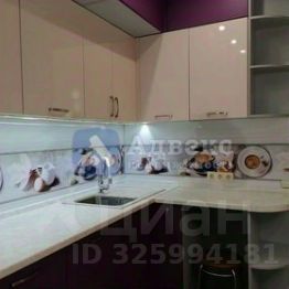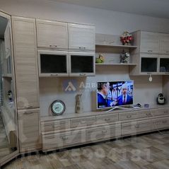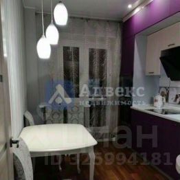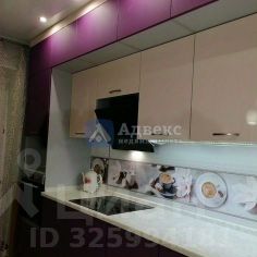 Кухня оборудована современной техникой, включая встроенную духовку и вытяжку. Интерьер выполнен в светлых тонах с акцентами фиолетового цвета, создающими стильный и современный вид. В прихожей установлен вместительный шкаф-купе, а в гостиной также современная вместительная стенка и удобный диван.