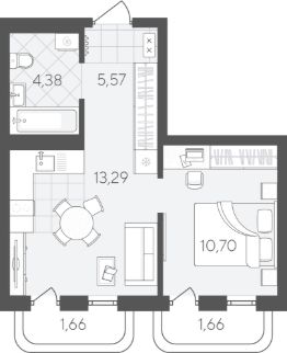В квартире есть кухня-гостиная и отдельная спальня, предусмотрены ниши под шкафы-купе. Это позволяет оставить больше пространства для жизни.