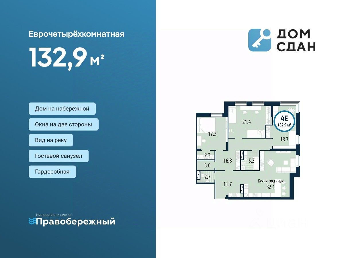 Квартира в готовом доме на набережной. Рядом школы и детский сад с билингвальным обучением. Первые этажи — коммерческие. В квартале уже работают магазины, пункты выдачи и кофейни. Для автомобилей предусмотрен подземный паркинг.