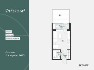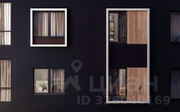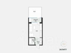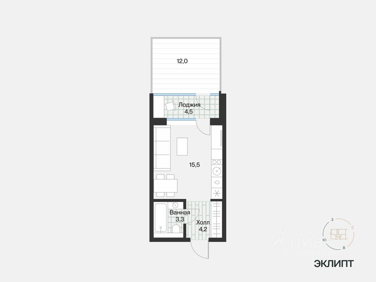 Студия с лоджией. Она с панорамным остеклением в пол. Там же выход в урбан-сад: летом можете поставить снаружи садовую мебель и выходить в урбан-сад, чтобы почитать книгу. Зимой — выпить горячий шоколад в пледе на свежем воздухе. Кухню можете разместить в нише и отгородить спальное место перегородками.