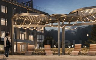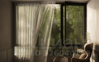 Она с панорамным остеклением в пол. Там же выход в урбан-сад: летом можете поставить снаружи садовую мебель и выходить в урбан-сад, чтобы почитать книгу. Зимой — выпить горячий шоколад в пледе на свежем воздухе. Кухню можете разместить в нише и отгородить спальное место перегородками.