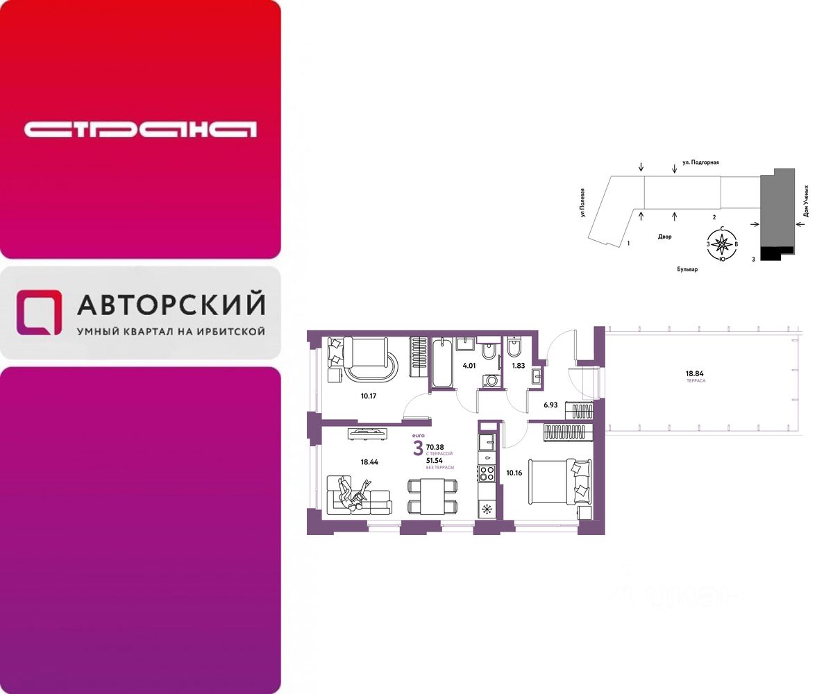 Продается 3комнатная квартира на 15 этаже от застройщика Страна Девелопмент. Площадь квартиры 70,69 кв. м.