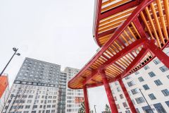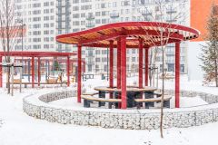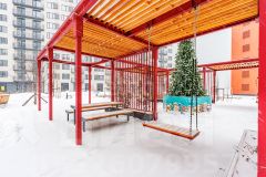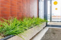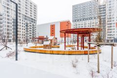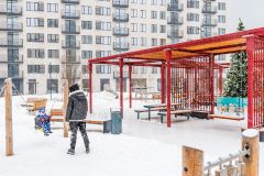 Фасад здания сочетает кирпичную кладку и современную штукатурку, создавая гармоничный архитектурный облик. Территория комплекса благоустроена: здесь предусмотрен пешеходный бульвар, закрытые дворы без машин, что гарантирует тишину и безопасность. Входные группы оборудованы безбарьерным доступом, теплыми тамбурами и домофонами. Дизайн общественных зон продуман до мелочей — мягкие зоны ожидания у лифтов, качественные отделочные материалы и внимание к деталям создают приятную атмосферу.