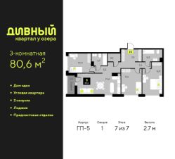 3-комн. квартира с предчистовой отделкой в ЖК "Дивный квартал у озера" на 7 этаже. Общая площадь: 80.6 кв.м., жилая: 34.8 кв.м., площадь просторной кухни-столовой: 19.5 кв.м. Угловая квартира, очень светлая, естественная вентиляция при открытии окон. В квартире одна лоджия, два совмещенных санузла. Высота потолков 2.7 м.