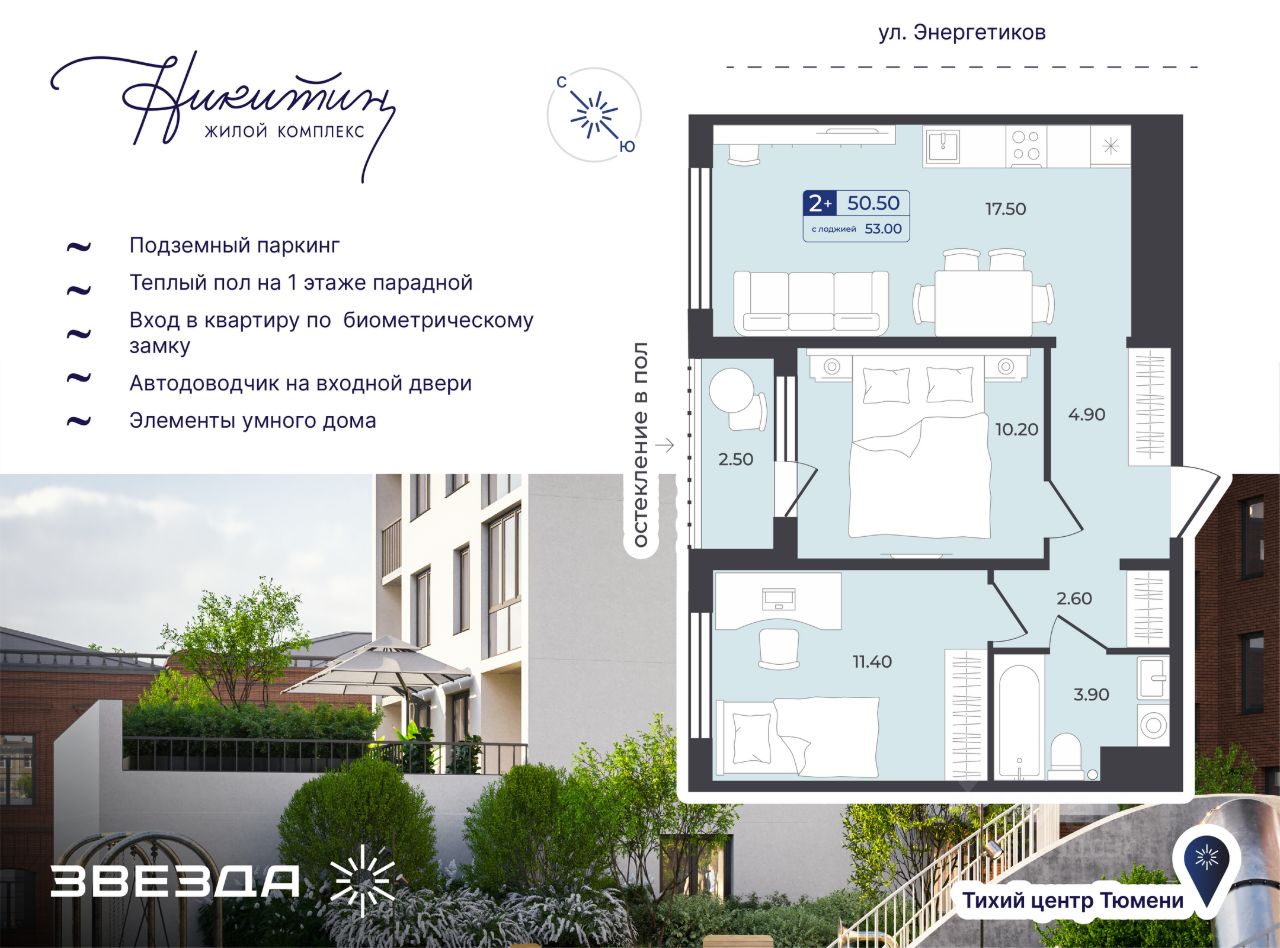 ЖК "Никитин" — жилой комплекс класса комфорт-плюс. Одно из главных его преимуществ — выгодное расположение. ЖК расположен в центральной части Тюмени, но в тихом и уютном месте. Здесь есть всё необходимое для будущих жителей: школы, гимназии, детские сады, спорткомплексы, студии, бизнес-центры и офисы. При этом окружённый скверами и парками, он защищен от шума и суеты большого города. Продуманное благоустройство, удобные планировки, стильные парадные и технологичные решения "Никитина" учитывают потребности современных горожан, делая их повседневность более комфортной.