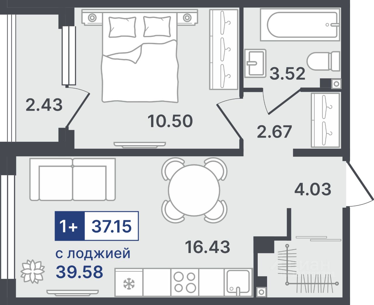 Общая площадь37,15 м²