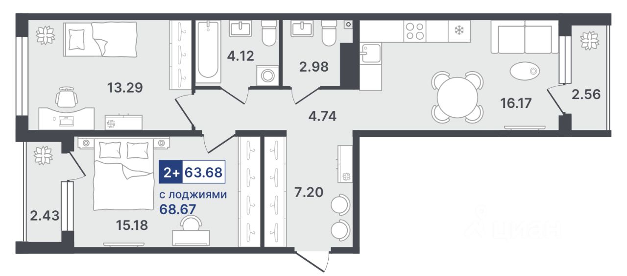 Общая площадь63,68 м²