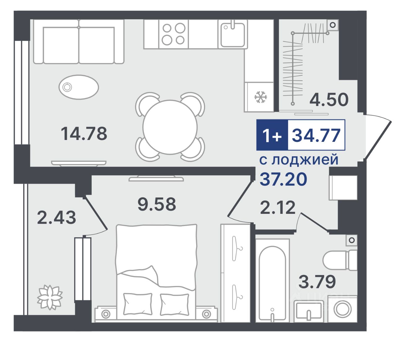 Общая площадь34,77 м²