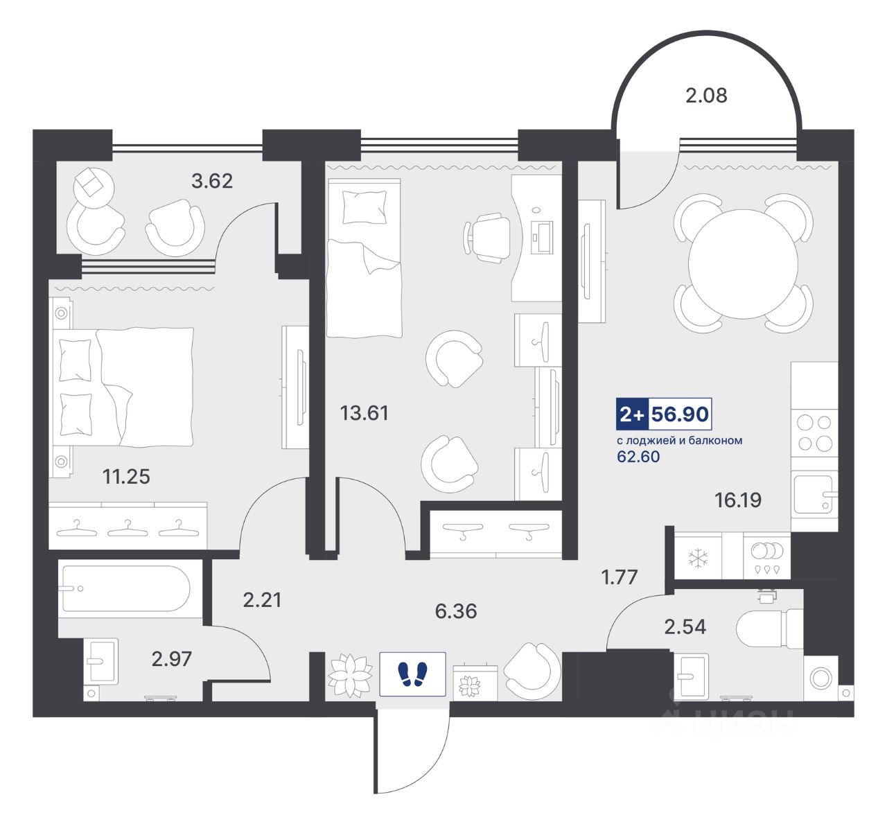 Общая площадь56,9 м²
