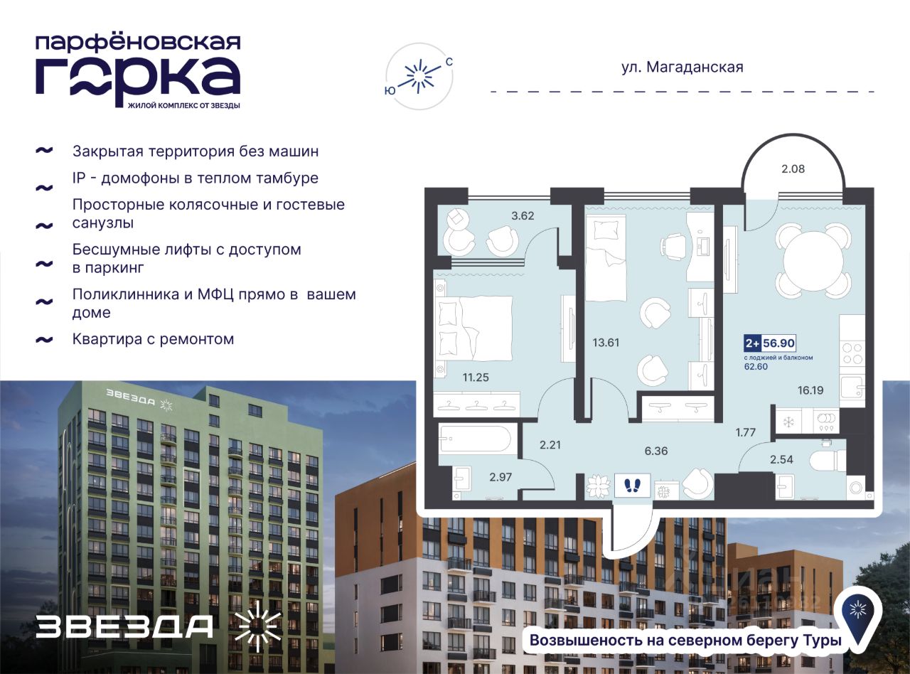 Название ЖК — не просто метафора, а часть истории Тюмени. В XVII веке на северном берегу Туры на возвышении основали деревню Парфенова. Сегодня на этом месте "Звезда" возводит современный ЖК комфорт-класса. Проект комплексного развития территории преобразит знакомый район Тюмени. В локации построят поликлинику с дневным стационаром на 100 посещений в смену и МФЦ. На первых этажах ЖК откроются супермаркеты, магазины, салоны и сервисы на каждый день — всё, что необходимо для комфортной жизни. Обслуживать дома будет сервисная компания "Звезда Управляет".