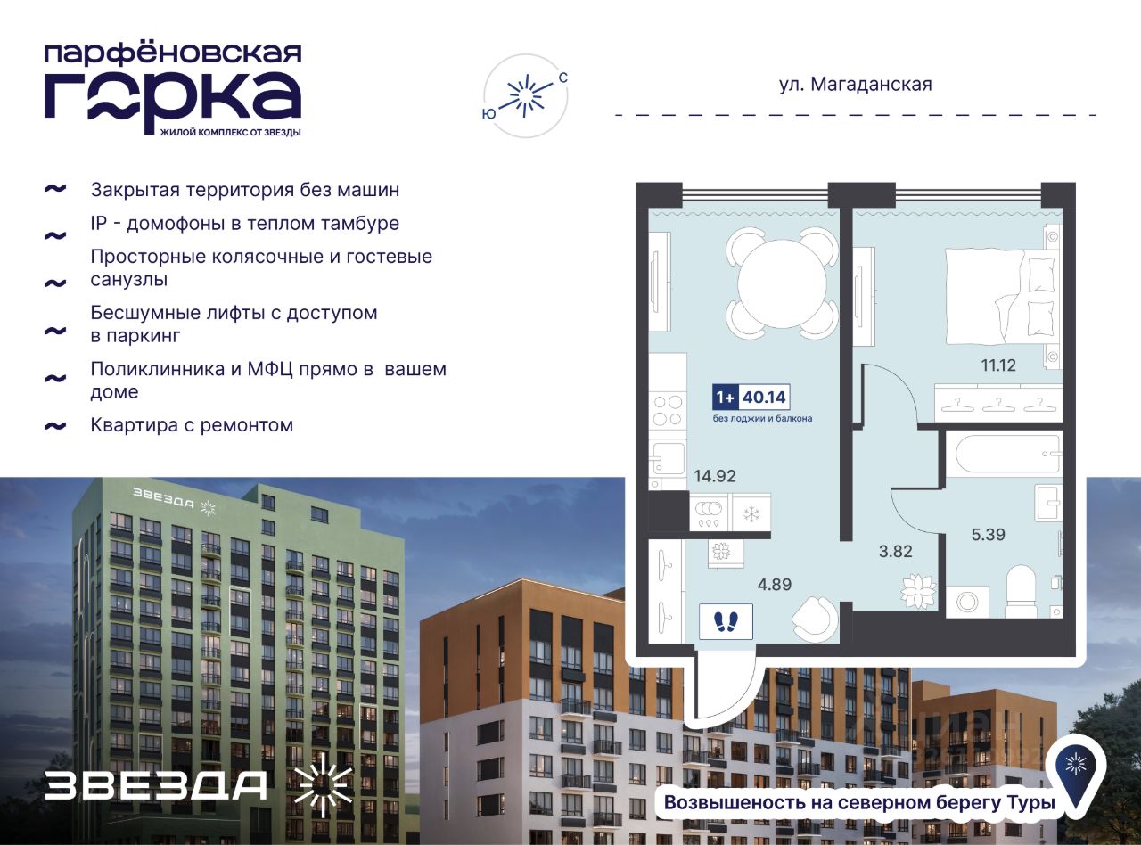 Название ЖК — не просто метафора, а часть истории Тюмени. В XVII веке на северном берегу Туры на возвышении основали деревню Парфенова. Сегодня на этом месте "Звезда" возводит современный ЖК комфорт-класса. Проект комплексного развития территории преобразит знакомый район Тюмени. В локации построят поликлинику с дневным стационаром на 100 посещений в смену и МФЦ. На первых этажах ЖК откроются супермаркеты, магазины, салоны и сервисы на каждый день — всё, что необходимо для комфортной жизни. Обслуживать дома будет сервисная компания "Звезда Управляет".